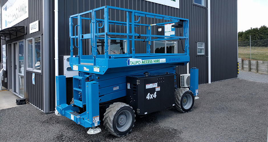 4x4 rough terrain scissor lift with stablisers, ideal for vertical access to non-uniform areas. 12.2m maximum access height, extendable work platform (3.7m x 1.45m). 450kg max load. Non-marking tyres. View Spec Sheet PDF »